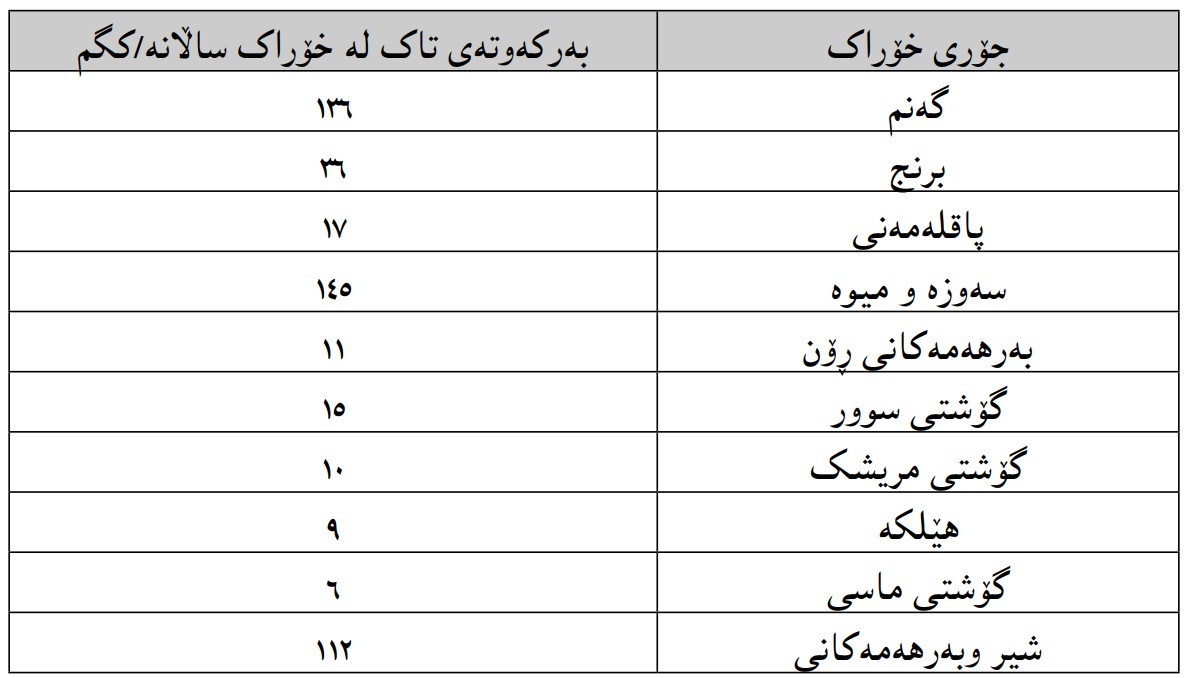 به ركهوتهی ههر تاكێكی عێراقی، به ههرێمی كوردستانهوه، بۆ خۆراک جیاوازه له جۆری خۆراكهكان، بهم شێوهیه، بۆ نموونه: گهنم بڕی (136 كگم) بۆ ههر ساڵێک، بهركهوتهی ههر تاكێک له برنج بڕی (36 كگم) بۆ ساڵێک، بهرههمە پاقلهمهنییهكان (وهكوو فاسۆلیا و نیسك و نۆک و لۆبیا) بڕی (17 كگم) پێویسته بۆ ههر تاكێک له ماوهی ساڵێكدا، بڕی سهوزه و میوه بۆ ههر تاكێک له ماوهی ساڵێكدا (145 كگم) پێویسته، بهرههمهكانی ڕۆن (ڕۆنی ڕووهكی و ڕۆنی ئاژهڵی) بڕی (11 كگم) پێویسته بۆ ههر تاكێک له ماوهی ساڵێكدا. سەبارەت بهرههمی ئاژهڵی و بهرههمی پهلهوهر و گۆشتی ماسی، بهركهوتهی ههر تاكێک له ماوهی ساڵێكدا بهم شێوهیەیە: بهركهوتهی ههر تاكێک له گۆشتی سوور بڕی (15 كگم)، بهركهوتهی ههر تاكێک له گۆشتی مریشک بڕی (10 كگم) بۆ ساڵێک، گۆشتی ماسی بڕی (6 كگم) بۆ ههر تاكێک له ماوهی ساڵێكدا. بۆ زانیاریی زیاتر، بڕوانه خشتهی ژماره (2)، بهركهوتهی ههر تاكێک له بهرههمه خۆراكییهكانی بهرههمی ڕووهكی و ئاژهڵی و پهلهوهر و گۆشتی ماسی.