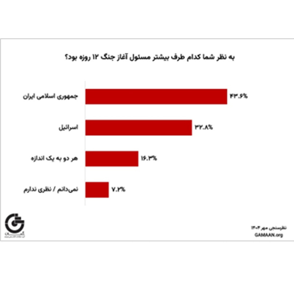 ڕووپێوەكە بەو مشتومڕە دەستپێدەكات كە كێ ئاگری جەنگی 12ڕۆژەی هەڵگیرساندووە یان خۆشكردووە؟ لە ڕوانگەی ئێرانییەكان خۆیانەوە و بە گوێرەی ئامارەكە، نزیكەی 44% كۆمەڵگە، ئێران بە بەرپرسی دەستپێكی جەنگ دەزانن. لەكاتێكدا 33% ئیسرائیل بە تاوانبار دەبینن و 16% هەردوولا وەك یەك سەیر دەكەن.