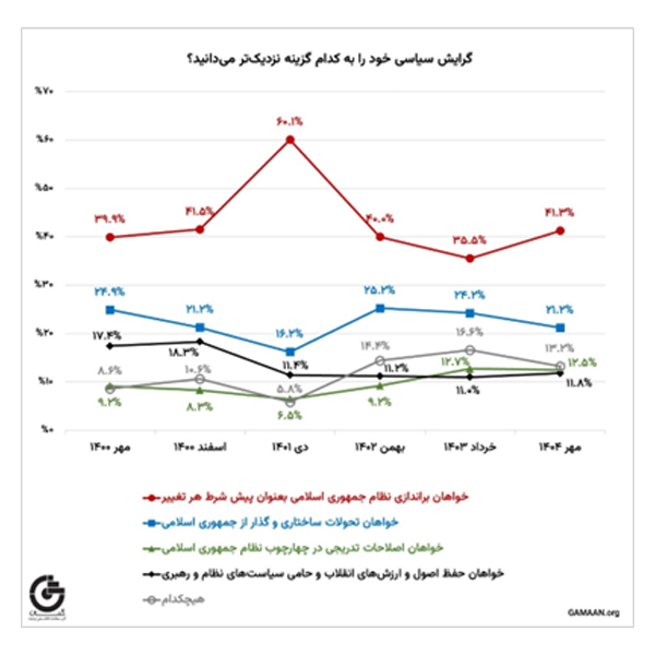 لەڕووی ئاڕاستەی سیاسی كۆمەڵگە و ڕوانینیان بۆ گۆڕانكاریی لە وڵاتدا، بەشداربووانی ڕووپێوەكە، لە ماوەی چوار ساڵدا بۆ چوار جۆر پۆڵێن كراون. ئەوانەی نەمانی ڕژێمی كوماری ئیسلامیی (براندازی) بە پێشمەرجی هەر جۆرە گۆڕانكارییەك دەزانن (39.30% -60.1%) كۆمەڵگەن. (24.9%-25.2%) داوای گۆڕانكاری ڕیشەیی و تێپەڕاندنی كۆماری ئیسلامیی دەكەن (. ئەوانەش خوازیاری چاكسازیی هەنگاو بە هەنگاون (اصلاحی) ڕێژەیەكی زۆر كەمن كە دەكاتە (9.2%-11%). ئەوانەش كە لایەنگری پاراستنی بنەما و بەهاكانی شۆڕشن و پشتیوانی سیاسەتەكانی ڕژێم و ڕێبەرین (اصولی) ڕێژەیان تەنیا یەك لەسەر چواری كۆمەڵگەیە. ئەم هێڵكارییەش یەكێكی ترە لە خاڵە زۆر گرنگ و جێی تێڕامانەكان كە كەلێنی نێوان كۆمەڵگە و دەسەڵات ڕوون دەكاتەوە.