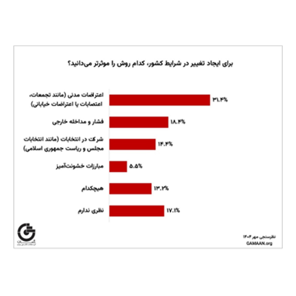 سەبارەت بە پێویستیی گۆڕانكاریی، پرسیار لە كۆمەڵگە كراوە كە چ ڕێگەیەكت پێباشە بۆ گۆڕانكاری لە ئێراندا، (31%) خەڵك ناڕەزایەتی و خۆنیشاندان بە ڕێگەی گونجاو دەزانن. هەروەها (18%) فشار و دەستوەردانی دەرەكی، (14.4%) بەشداری لە هەڵبژاردنەكان و (5.5%) خەباتی توندوتیژئامێز بە ڕێگەچارە دەزانن. ئەم تەوەرەی ڕووپێوەكە پێمان دەڵێت كە یەكێك لە كێشە سەرەكییەكان كۆمەڵگەی ئێران سەبارەت بە گۆڕانكاری لە دەسەڵاتدا هەر ئەو ناكۆكییە و تێگەیشتە جیاوازەی خەڵكە. واتە خەڵكی ئێران خۆشیان نەگەیشتوونەتە ڕێكەوتنی كۆتایی بۆ گۆڕانكاری، ئێستا كە خۆنیشاندانەكان دەستیان پێكردووەتەوە دەبینین كە ڕێژەی ئەو كەسانەی كە خۆنیشاندان دەكەن لەو (31%) كەمترە كە لە ڕووپێوەكەدا جەخت لەسەر گۆڕان لە ڕێگەی خۆنیشاندان دەكەنەوە.