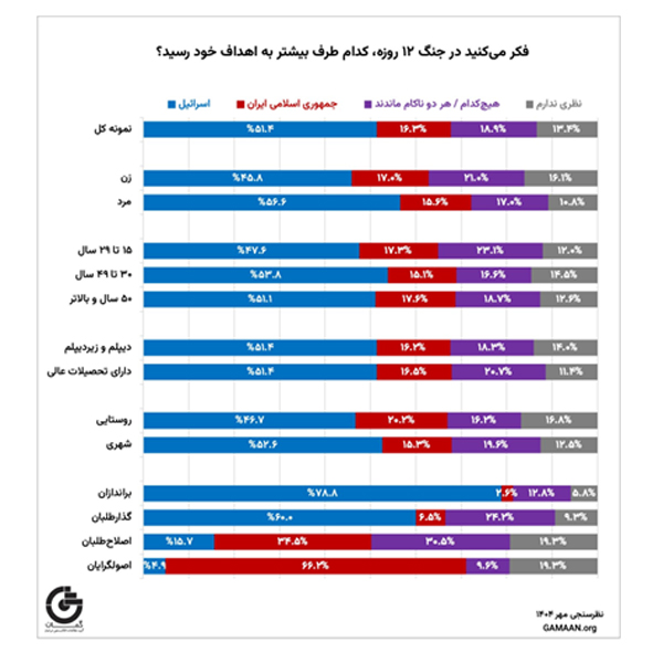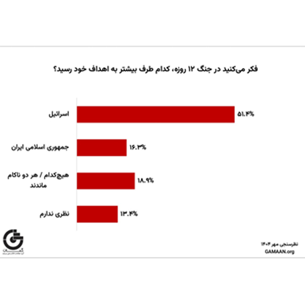پە پشتبەستن بە ڕووپێوێك كە گرووپی توێژینەوەكانی هەڵسەنگاندنی هزری ئێرانییەكان (گمان)([9]) ئەنجامی داوە، كە دامەزراوەیەكی سەربەخۆیە و تۆماركراوە لە وڵاتی هۆڵەندا، دەتوانین وەڵامی زۆرێك لەو پرسانە بدەینەوە كە سەبارەت بە زەمینەی سەرهەڵدانی جەنگی 12ڕۆژە، دۆخی جەنگ و دەرەنجامەكانی لە كۆڕ و كۆبوونەوە سیاسییەكان و میدیادا بڵاو كراونەتەوە. جیاوازی ئەم جۆرە لە زانیارییەكان لەوەدایە یارمەتیمان دەدات لە هەناوی كۆمەڵگەی ئێرانەوە و لە ڕوانگەی كۆمەڵگەوە ڕووداوەكان و دۆخی هەنووكەیی ئێران بخوێنینەوە.