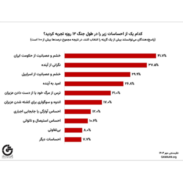 لە وەڵامی پرسیارێكدا سەبارەت بەو هەستانەی كە لە ماوەی جەنگدا ئەزموونیان كردووە، “توڕەیی بەرامبەر بە حكومەتی ئێران” زۆرترین پشكی بەركەوتووە كە 42% خەڵكی ئێرانە، واتە كۆمەڵگەی ئێرانی لە سەروبەندی جەنگی 12ڕۆژەدا زیاتر لە هەر دیاردە و ڕووداوێك لە حكومەت و دەسەڵات توڕە بووە. پاش ئەوە ئەزموونەكانی “نیگەرانی لە ئایندە” (38%)، “توڕەیی لە ئیسرائیل” (30%)، “هیوا بە ئایندە” (27%)، “ترس لە مردنی ئازیزان” (21%)، و هەستی پرسە و خەم بۆ كوژراوەكان (17%) ی ئەو هەست و سۆزانە پێكدەهێنن كە ئەوان ئەزموونیان كردووە.