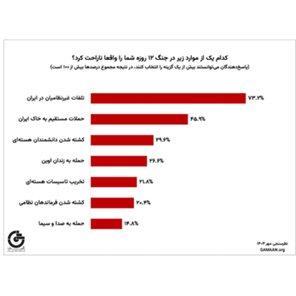 یەكێكیتر لە بۆچوونە زۆر سەرنجڕاكێشەكان كە دەرخەری كەلێنێكی ئاشكرای خەڵك و دەسەڵاتە، پرسیارێكە سەبارەت بە دەرەنجامەكانی جەنگ. زۆرینەی كۆمەڵگە (73%) ڕایانگەیاندووە كە بە قووڵی هەستیان بە ئازار كردووە بەرامبەر بە “كوژرانی خەڵكی مەدەنی”. پاش ئەوە (46%) “هێرشی ئاشكرا بۆ سەر خاكی ئێرانیان” بەلاوە قوورس بووە، دواتر “كوژرانی بیرمەندانی ناوەكی”(30%)، هێرش بۆسەر بەندیخانەی ئێڤین”(27%) زۆرترین ئازاری پێگەیاندوون، (22%) “لەناوبردنی بنكە ئەتۆمییەكان” و تەنیا (20%) بەرامبەر بە “كوژرانی فەرماندە سەربازییەكان” هەستیان بە ئازار كردووە. كۆتا هەڵبژاردنیش “هێرش بۆ سەر میدیای فەرمیی ئێران (صدا و سیما) كەمترین ڕێژەی بێتاقەتی ئێرانییەكانی لێكەوتووەتەوە كە ڕێژەكەی تەنیا (15%) بووە. ئەم پرسیارە بە ئاشكرا ڕوانینی ئێرانییەكانی سەبارەت بە دامەزراوە فەرمییەكانی دەسەڵات ڕوون كردووەتەوە. لە دوای بوونە قوربانیی خەڵكی مەدەنی ئەوەی خەڵكی ئازار داوە هێرش بووە بۆ سەر خاكی وڵاتەكەیان، كە ڕەنگە كەمتر لە مێژووی وڵاتاندا ڕوویدابێت كە زۆرینەی خەڵك هەڵوێستیان بەرامبەر پەلاماردانی وڵاتەكەیان نەرێنی بێت كە دەكات (53%).