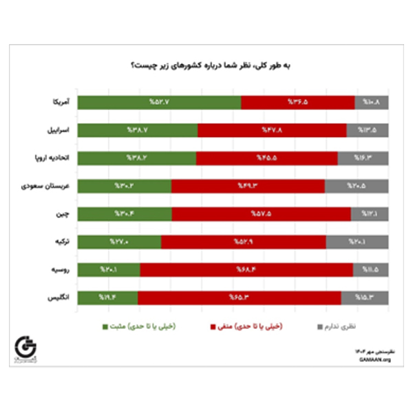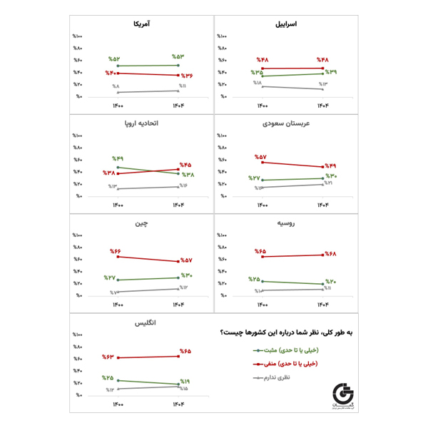 لەم هێڵكارییەی خوارەوەدا ئاستی گۆڕانكاری ڕوانینی ئێرانییەكان سەبارەت بە وڵاتەكان لە نێوان ساڵانی (1400-1404) هەڵسەنگێنراوە. ئەوەی جێگەی مەترسییە بۆ دەسەڵات لە ئێراندا ئەوەیە كە ڕاستە دوای جەنگەكە، ڕوانینی ئەرێنی كۆمەڵگە بۆ ئەمریكا وەك خۆی ماوەتەوە، بەڵام ڕوانینی نەرێنی خەڵكی بۆ ئەمریكا 4% كەمی كردووە، كەواتە سۆزی نەرێنیی خەڵك بۆ ئەو وڵاتە كەمتر بووەتەوە، بۆ ئیسرائیلیش بە پێچەوانەوە، ڕوانینی نەرێنی كۆمەڵگە بۆ ئەو وڵاتە نەگۆڕاوە، بەڵام ڕوانینی ئەرێنیان بۆ ئیسرائیل نزیكەی (4%) زیادی كردووە. سەبارەت بە وڵاتانی دیكەی وەك ڕووسیا و بەریتانیا ڕوانینی خەڵكی كەمترە، هەروەها بۆ توركیا و سعودییە و وڵاتانی ئەورووپاش.
