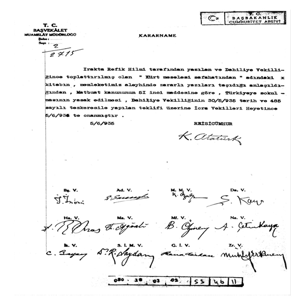 هەر لە چوارچێوەی هەوڵەکانی حکومەتی تورکیا بۆ قەدەغەکردنی مێژوو و شوناسی کورد، بە پێی نوسراوی ژمارە (٢٧١٥/٢)، لە ڕێکەوتی (٥/٦/١٩٣٥)، حکومەتی تورکیا لە سەر ڕاسپاردەی وەزارەتی ناوخۆو بە گوێرەی ماددەی (٥١)ی یاسای چاپەمەنییەکان، بە واژۆی سەرۆککۆمار؛ مستەفا کەمال، عیسمەت ئینۆنۆی سەرۆکوەزیرانو وەزیرەکانی کابینەی دەوڵەت، بڕیاری یاساغکردنی کتێبی چەند لاپەڕەیەک لە مەسەلەی کورد (Kürt meselesi safahatından) دراوە، کە لە عێراقدا لەلایەن ڕەفیق حیلمییەوە نووسراوەو لە بڕیارەکەدا هاتووە: نابێت ڕێگەبدرێت ئەم کتێبە لە ناو خاکی تورکیادا بڵاوبکرێتەوە. سەبارەت بە هۆکاری قەدەغەکردنی ئەم کتێبە لە بڕیارەکەدا هاتووە: بە هۆی ئەوەی بۆمان دەرکەوتووە ئەم کتێبە نوسینی زیانبەخشی لە دژی دەوڵەتەکەمان تێدایە، بۆیە بە پێی ماددەی (٥١)ی یاسای چاپەمەنییەکان بڕیاری قەدەغەکردنی دراوە(١٧).