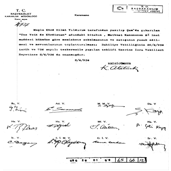 سەرۆکایەتیی کۆماری تورکیا بە واژۆی مستەفا کەمالی سەرۆککۆمار، عیسمەت ئینۆنۆو وەزیرەکانی کابینەی دەوڵەت، هەردوو کتێبەکەی حیلمی یەڵدرمی قەدەغەکردووە. بە چەشنێک لە دانیشتنی ڕۆژی (٢)ی (٦)ی (١٩٣٦)دا بڕیاری قەدەغەکردنی کتێبێکی حیلمی یەڵدرمی خەڵکی موش بە ناوی دەنگێک لە کوردستانەوە (Une veox Kurdistan) دراوە، کە بە زمانی فەرەنسی لە شام دەریکردووە. لە بڕیارەکەدا هاتووە: کتێبەکە بە پێی ماددەی (٥١)ی یاسای چاپەمەنییەکانو لە سەر ڕاسپاردەی وەزارەتی ناوخۆ، بە نوسراوی ژمارە (٧٣٦)ی ڕۆژی (٢٩)ی ئایاری (١٩٣٦) قەدەغەکراوەو بڕیاردراوە ئەو کۆپییانەی کتێبەکە کە بڵاوکراونەتەوە، کۆبکرێنەوە(٢٠).