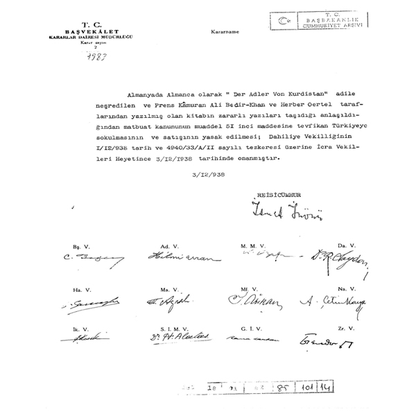 بە پێی بڕیارێکی کۆماری تورکیا، بە ژمارە (٩٩٨٣/٢)، لە (٣/١٢/١٩٣٨) دەرچووەو واژۆی عیسمەت ئینۆنۆی سەرۆککۆماری ئەو کاتە، جەلال بایاری سەرۆکوەزیرانو وەزیرەکانی کابینەکەی لە سەرە، تێیدا هاتووە: کتێبی هەڵۆی کوردستان (Der Adler Von Kurdistan)، کە لە ئەڵمانیا بە زمانی ئەڵمانی لەلایەن میر کامەران عەلی بەدرخانو (Herber Oertel)ەوە نووسراوە، لەبەرئەوەی کتێبەکە نوسینی زیانبەخشی تێدایە، بە گوێرەی ماددەی (٥١)ی یاسای چاپەمەنییەکان، هێنانی بۆ تورکیاو فرۆشتنی قەدەغەکراوە. ئەم بڕیارەش بەرمەبنای نوسراوی وەزیری ناوخۆ لە ڕێکەوتی (١/١٢/١٩٣٨)، بە نوسراوی ژمارە (٤٩٤٠/ ٣٣/ A/ II)، لە (٣/١٢/١٩٣٨)دا لەلایەن حکومەتەوە بڕیاری قەدەغەکردنەکەی پەسەندکراوە(٢٤).